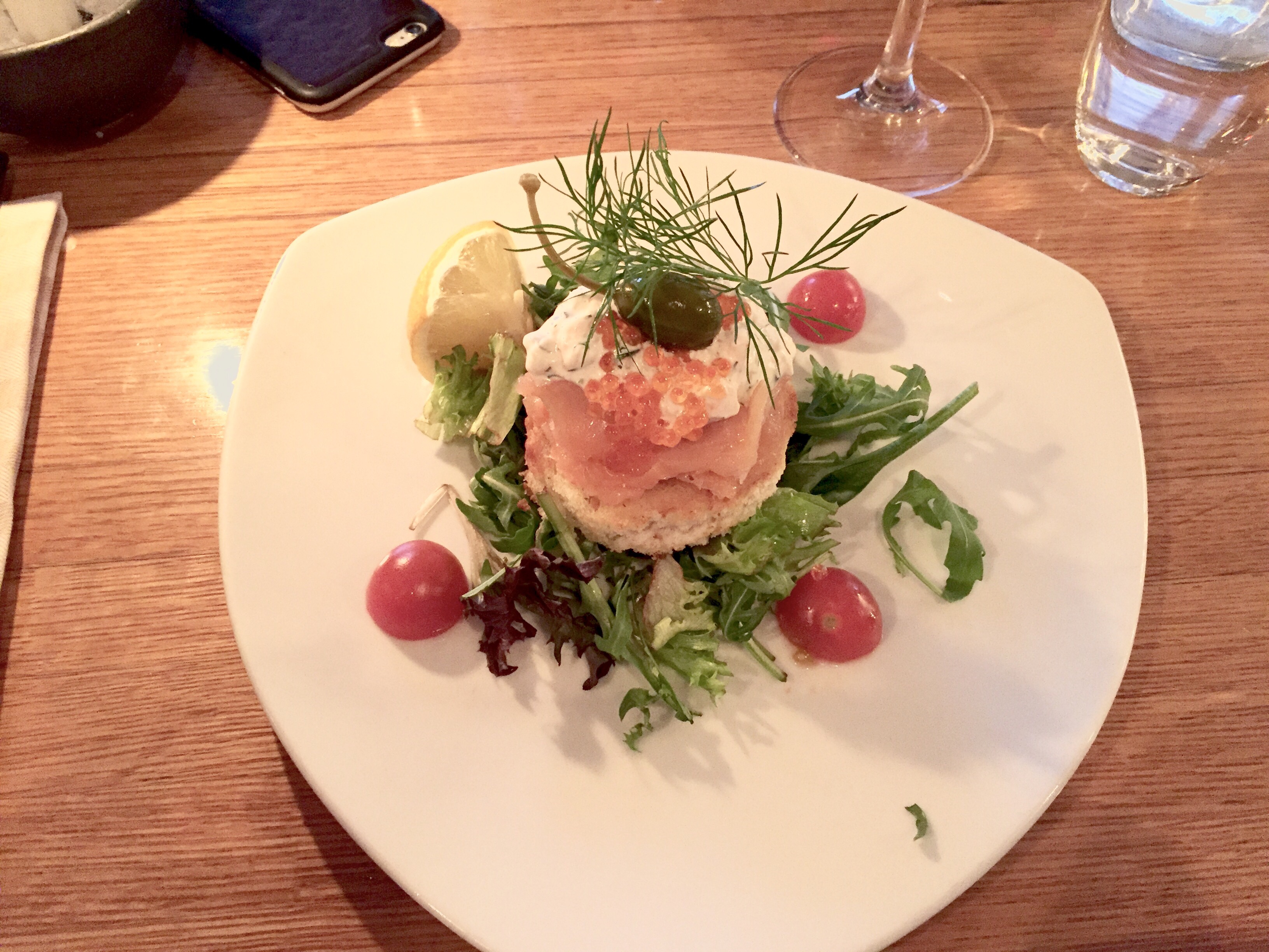Förrätt: Bröd med kallrökt lax, pepparotscreme, räkor, dill och forellrom.