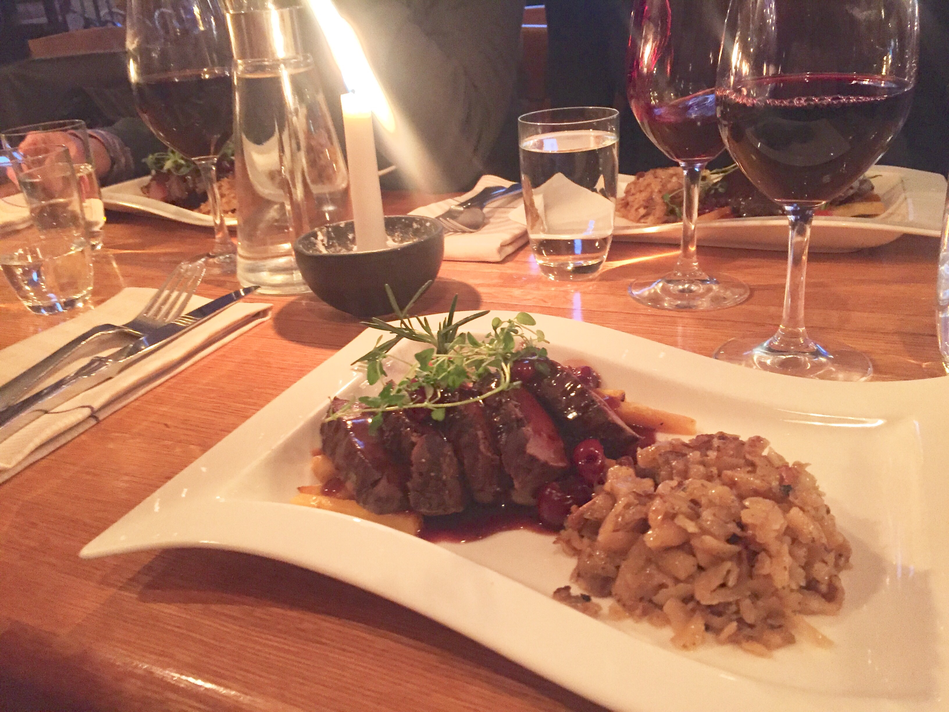 Huvudrätt: Grillad dovhjortytterfilé med körsbär- & enbärssky, honungsrostade rotfrukter och Kantarell-rösti.